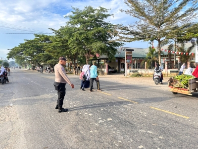 Rantau Selamat – Personel Polsek Rantau Selamat Polres Langsa melaksanakan kegiatan Strong Point pagi di Jalan Medan–B. Aceh, Desa Bayeun, Kecamatan Rantau Selamat, pada Rabu, 28 Oktober 2025.