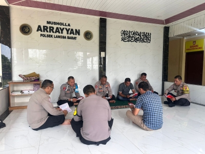 Langsa Barat – Personel Polsek Langsa Barat Polres Langsa melaksanakan kegiatan Pembinaan Rohani dan Mental (Binrohtal) yang berlangsung di Mushola Polsek Langsa Barat. Kegiatan ini bertujuan memperkuat keimanan dan ketakwaan anggota dalam menjalankan tugas kepolisian. Kamis, 30 Oktober 2025.