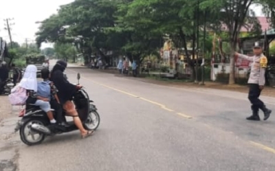 Polsek Rantau Selamat Gelar Pengaturan Lalu Lintas dan Strong Point Pagi di Jalan Medan–Banda Aceh