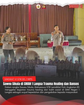 Langsa— Mahasiswa Sekolah Tinggi Ilmu Kepolisian (STIK) PTIK Angkatan 83 Widya Parama Satwika Lemdiklat Polri melaksanakan kegiatan trauma healing sekaligus sosialisasi keselamatan lalu lintas kepada siswa-siswi SMA Negeri 1 Langsa sebagai bagian dari program Pengabdian Masyarakat (Dianmas) di Provinsi Aceh, guna membantu pemulihan psikologis pelajar serta meningkatkan kesadaran disiplin dan keselamatan di jalan raya. Sabtu (14/02/2026).