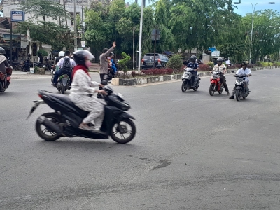 Petugas melakukan pengaturan lalu lintas guna mengurai kepadatan kendaraan serta memastikan arus lalu lintas tetap berjalan dengan tertib dan lancar, sehingga aktivitas masyarakat dapat berlangsung dengan aman dan nyaman.